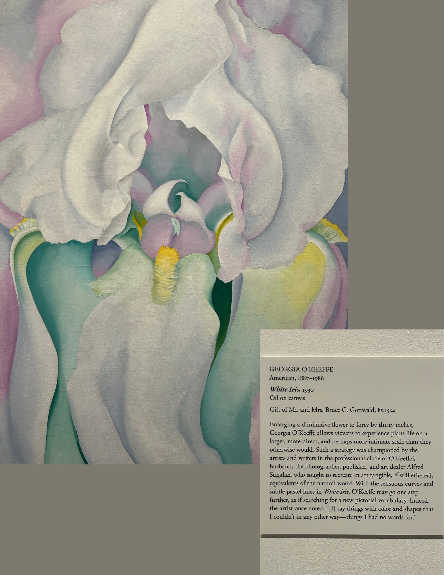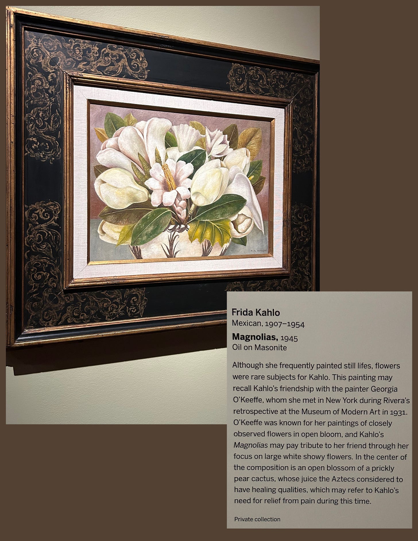 Walking out of the restaurant on my way to the exhibit, I happened upon White Iris (1930) by Georgia O’Keefe, old school baddie of the American Southwest. The painting caught my attention in periphery at first, like a rainbow one is about to speed by on a drive. I swerved and swayed, my breath gone. I was mesmerized. It was as though the I could hear the flower blooming and rustling. Georgia did all that with oil. I did not know it yet, but over an hour later, at the tail end of the Frida exhibit, I would see Magnolias (1945) by Frida Kahlo. Before even reading the museum label, I would be instantly transported back to White Iris. Then, upon reading the label I would nod in recognition at the power of friendship.