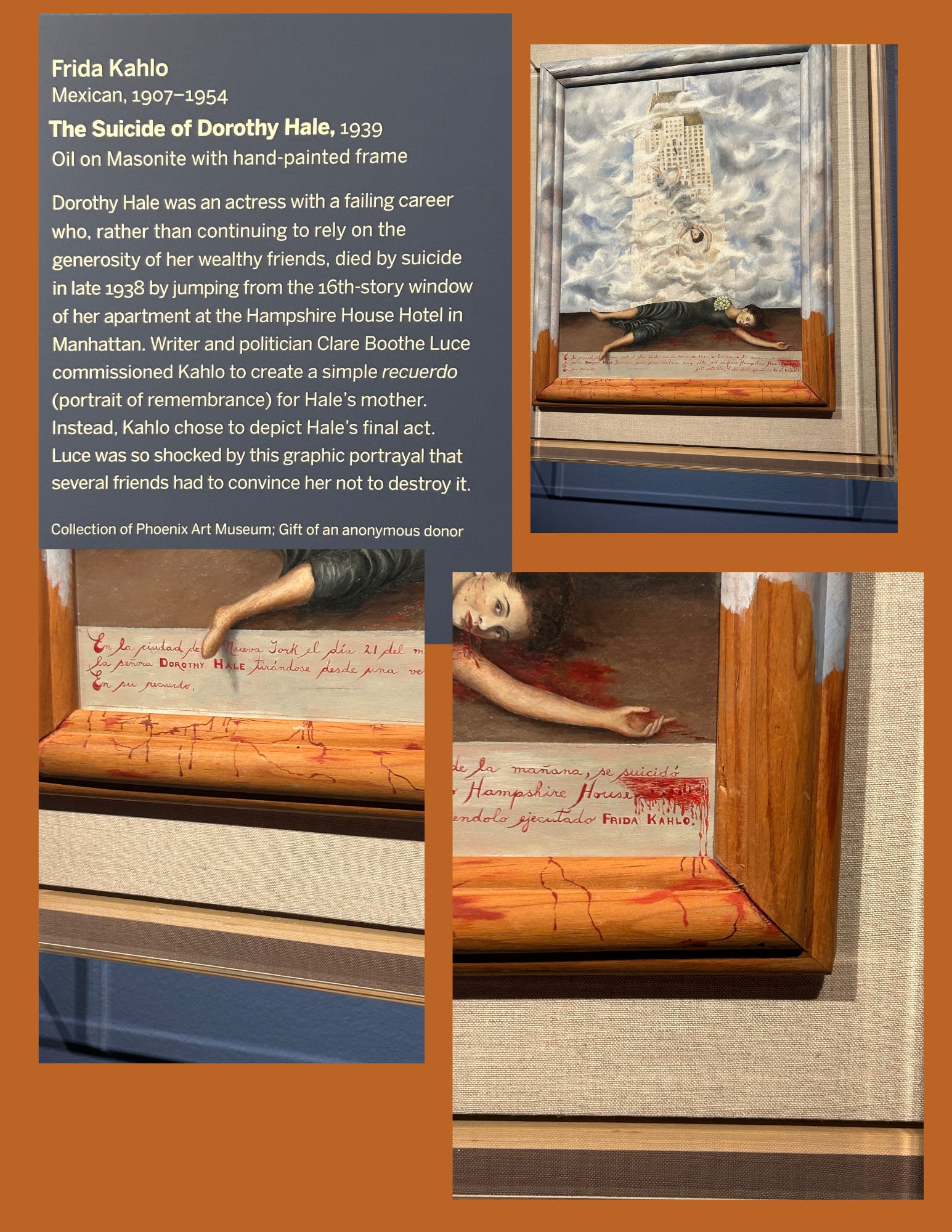 Throughout the exhibit’s walkthrough, The Suicide of Dorothy Hale (1939) is set up on its own, along a wall in direct line of sight for anyone walking through the exhibit. It is spotlighted via positioning and the literal lighting choices made around it. Before arriving to that painting during my walkthrough, I had been struck by how little I actually knew about Frida beyond the details of her bus accident, her later public persona, and the haunting of Diego Rivera in her life. Three new details for me that day are also similarities between us: we share a birthday week, she was a sister, she was not impressed by New York City. These new bits were swirling through my head when I happened upon Dorothy’s death. That’s just what it felt like to walk into the world of that painting, casually happening upon someone falling from a skyscraper and being stopped in one’s tracks, unable to look away, at a loss for what to do.